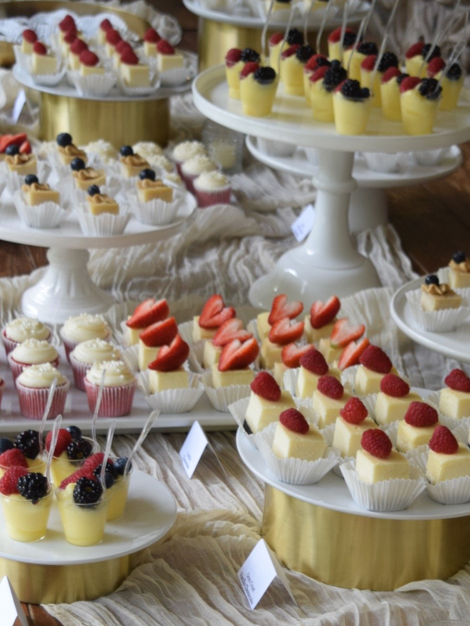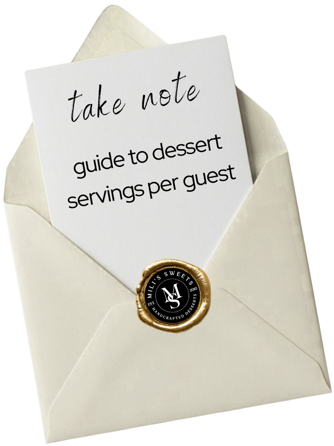 If you’re looking to have a generous amount of mini dessert servings, 2-3 servings per guest is recommended. If you’re looking to have ‘just enough‘ we recommend you consider 1.5 servings per guest, including any cake slices you may offer, even if to only a portion of the total headcount.