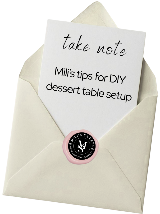 If you booked full services, we curate your dessert table set up. However, if you booked Miliโs Sweets and chose doโitโyourself setup – or youโre providing your own pedestals and risers at your venue – I provide all of the info you’re looking for. There’s a lot to consider: What’s your style? Do you have pieces, or need to purchase? Do you want to refill your dessert table, or have everything set all at once?
